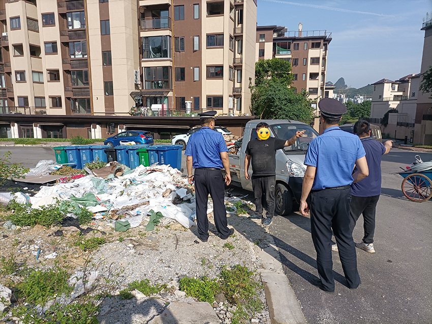面对执法人员的询问,黑衣男子表示自己是在小区里做装修工程的,当天他“做完工”后,看到还有10多袋建筑垃圾,因数量不多,他懒得请车清运,决定自行处理。在小区门口,他看到空地上放有许多垃圾桶,就把垃圾丢到了旁边,对相关的城市管理规定并不了解。执法人员对他进行了批评教育,并当场开具行政文书,要求他立即整改,并配合调查。