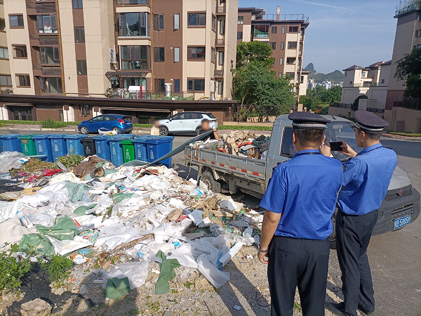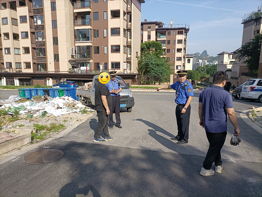 执法人员赶到现场,看到一辆微型小货车停在现场,车厢的侧板打开,车厢里装着不少的建筑垃圾,车旁还站着3名男子。经询问,其中的黑衣男是车主,其他2人则是小区物业工作人员。一名物业人员说,当天他们发现黑衣男在这里乱倒建筑垃圾,便将车拦下,并拨打了投诉电话。