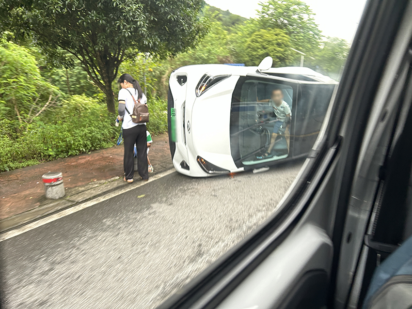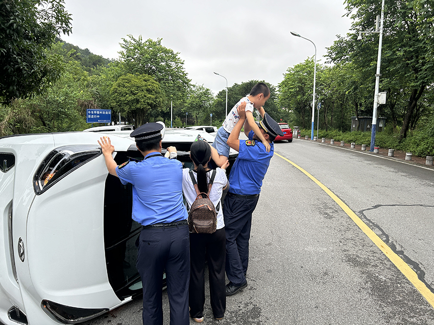 当天下午4点20分左右,城中区综合行政执法局的执法人员在路过水冲屯附近路段时,发现对面的快车道上侧翻着一辆新能源小汽车,一名女子带着一个小孩站在车旁,而侧翻的车内还有一名小孩。见状,执法人员立即靠边停车,上前帮忙。
