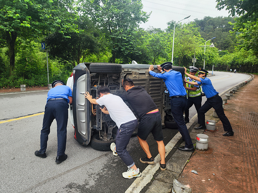 (城中区执法局讯 通讯员邓湖广报道)近日,环江滨水大道水冲屯附近路段,一辆小汽车撞到路边隔离桩发生侧翻,一名小孩被困车内。巡查经过此处的执法人员发现后,立即停车相助,解救出被困人员。