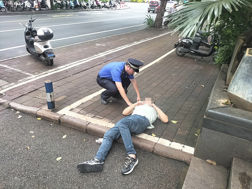 (城中区执法局讯 通讯员邓湖广报道)7月1日,一名喝得酩酊大醉的男子,躺在城中区瑞安路的人行道上呼呼大睡,巡查经过的执法人员发现后,及时伸手相助。
