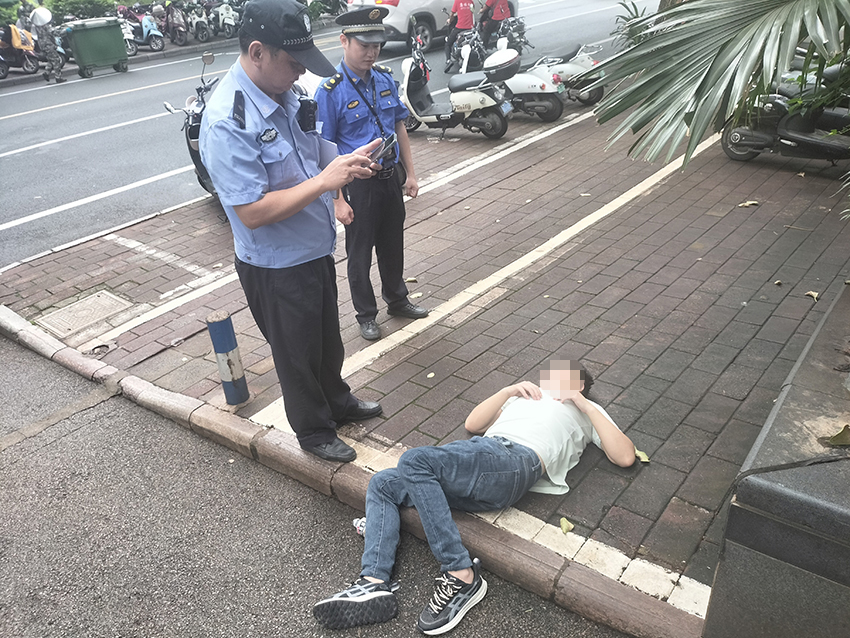当天上午8点半左右,城中区综合行政执法局执法队员巡查市容时,发现一名浑身散发酒气的男子躺倒在瑞安路九洲国际大厦附近的人行道上呼呼大睡。