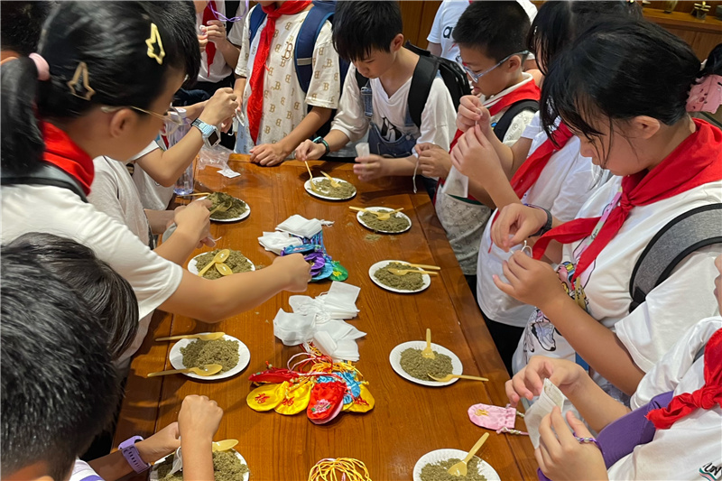 同心营第二站,柳州市中医医院东院。活动当天正值“立秋”,在“二十四节气长廊”,通过讲解员的介绍,队员们了解了自然节律变化,更深刻直观感受到“二十四节气”所蕴含着悠久的文化内涵和历史积淀。在中医文化展示区,队员们学习到了博大精深的中医药文化,也了解了中药香囊的功效。在医生老师的示范下,队员们动手装草药,制作出一个个精美的中药香囊,进一步加深了对中药材特性和用途的理解,培养了弘扬中医药文化的兴趣,增强了少先队员对中华优秀传统文化的自信心与自豪感。在药膳坊,中医院的老师还贴心地为队员们准备了秋天的第一杯奶茶,中药的香和奶茶的甜让队员们更深刻地体会到中药与日常生活相融合的魅力。最后,中医院专业医护人员通过讲解和演示相结合的方式,向少先队员教授预防溺水、紧急救护、心肺复苏等暑期自护救助技巧,提高少先队员的自我保护能力。