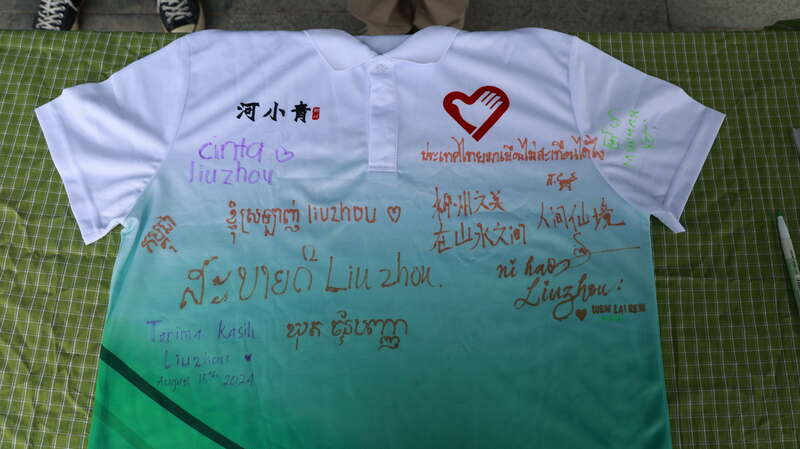 “柳州之美在山水之间”“优美的环境离不开青年志愿者的贡献”……在“河小青”志愿者的T恤上,各国营员们纷纷写下对柳江环境治理的感受和祝愿。