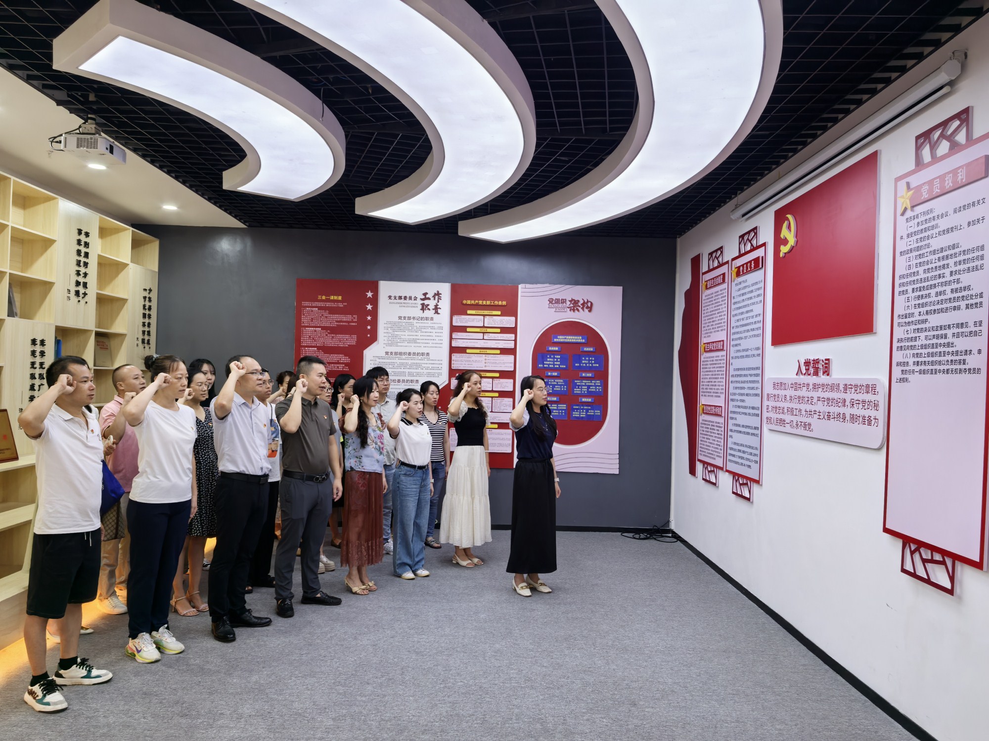 参观环节,城中区财政局党员、入党积极分子、部分党外干部及城中区荔浦商会党支部党员代表一行在讲解员带领下,走进城中区税务局党建教育基地进行参观学习,城中区税务局党建教育基地是柳州市税务系统中首个“党建+廉政+普法+学习”一站式党建文化室,基地分为思想同向、共建同心、智税同行、党群同欢四个主题展区,参观队伍随讲解有序前进,大家认真聆听,对党的建设、廉政教育、税收陈列、税收普法、智能化办税等内容进行了细致了解,最后,共建支部党员们在区财政局党支部书记钱雪春的带领下整齐列队宣誓,一同重温了入党誓词,再一次用铮铮誓言诠释入党初心。