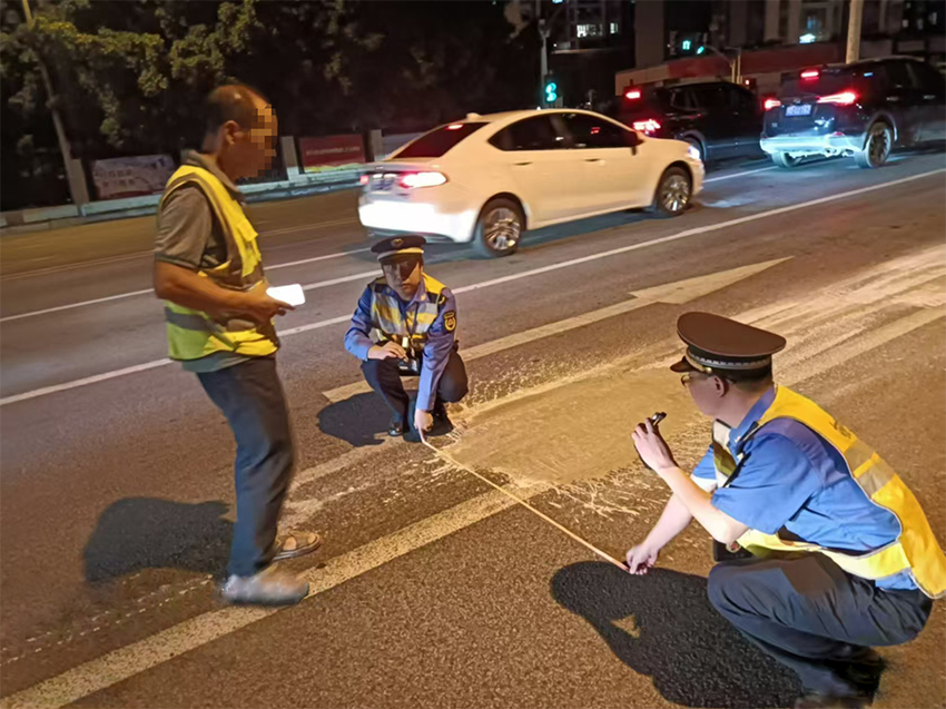 与当事司机沟通后,执法人员对被污染的路面进行了测量,发现被污染的路面宽1.3米,长67米,共87余平方米道路面积被污染。根据相关规定,执法人员现场开具执法文书,要求当事司机立即采取措施冲洗路面,并到执法部门配合调查。
