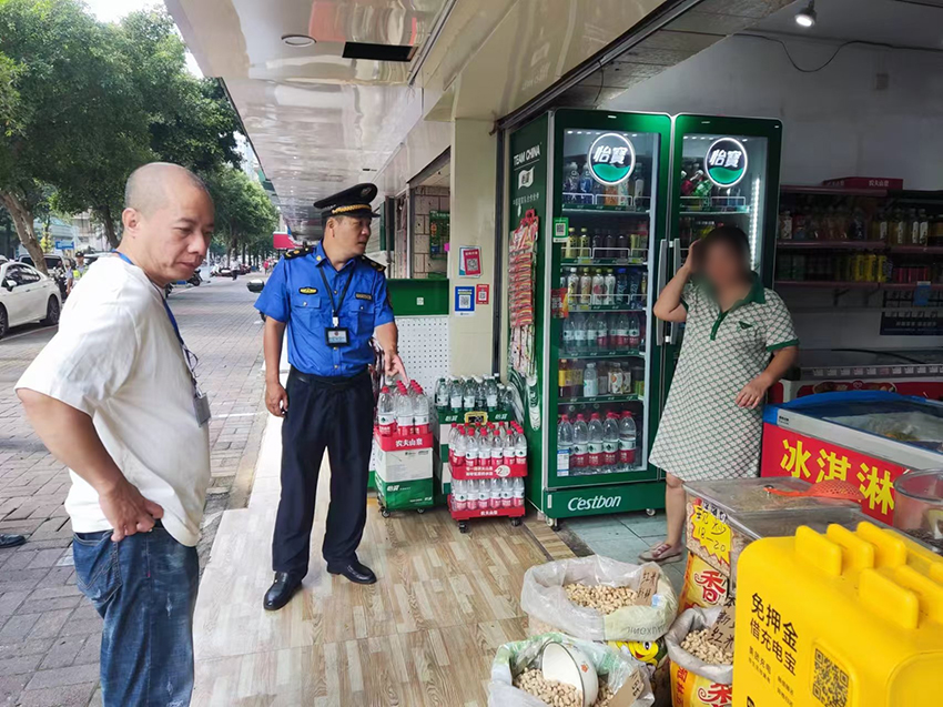 “老板,您门口这些水和花生不能摆在门前路面,请您收进店里面。”当天上午9时,执法人员在体育路检查时,发现一家冷饮小卖部门口堆了不少物品,立即与店内工作人员进行了交流。工作人员表示店里刚进了一批货,未整理好,所以就把一些物品先放到了门口,会很快收回店里。在了解清楚情况之后,执法队员向工作人员进行宣传教育,并要求其立即整改。当事店面也立即对门口进行了清理。