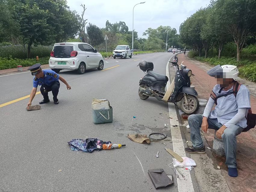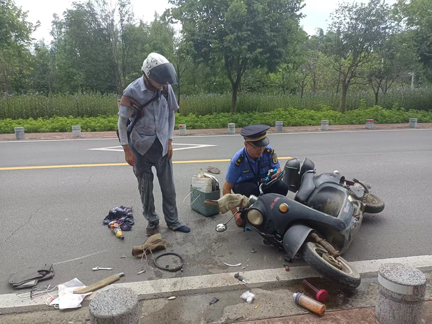 为避免影响道路通行,执法人员将电动车扶起后,又帮他将散落的物品一一捡起。随后表示帮他拨打急救电话。然而男子却表示身体没大碍,只是有点“心慌后怕”歇一会就可以自己开车回家,让执法人员不要管他。