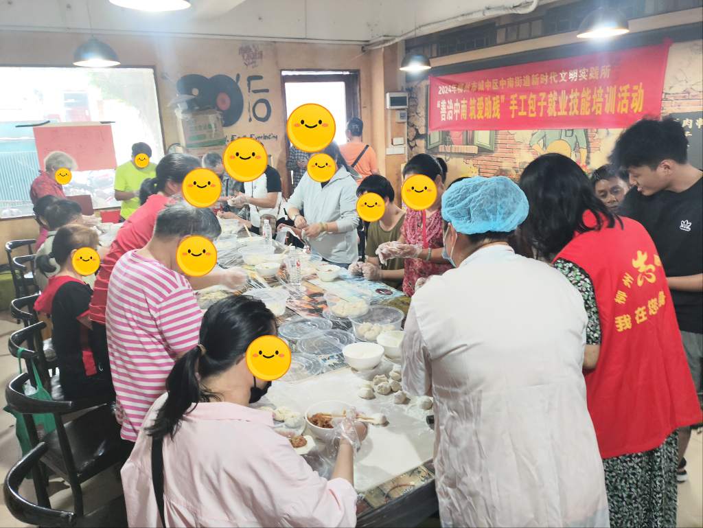 图为残联专委和残疾学员们一起其乐融融包包子的场景