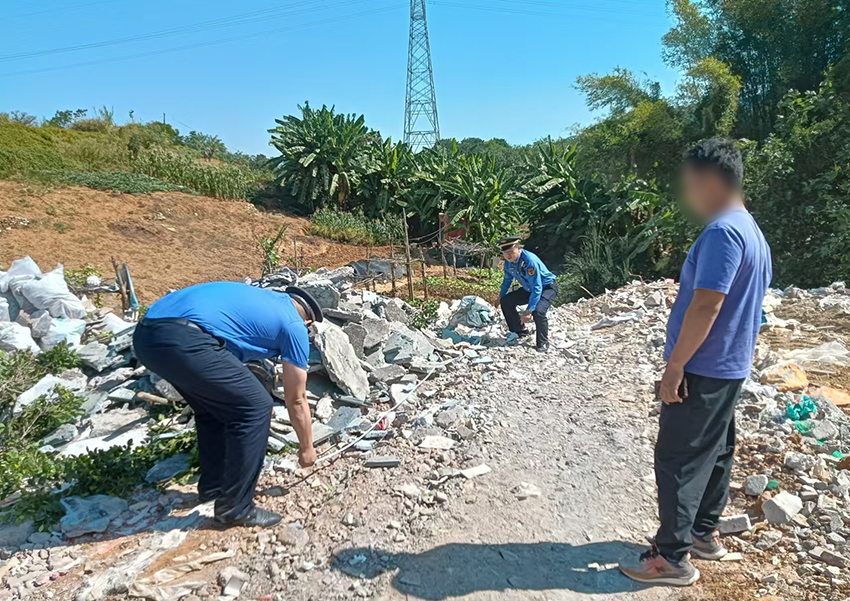 当天下午2点左右,城中区综合行政执法局执法队员巡查途经桂柳路莲花山庄附近时,看到一辆相向而来的中型货车突然拐向了附近的一片空地。货车车厢虽然盖有篷布,但执法人员仍然可从裸露出的部分看到车厢里装的是用蛇皮袋装着的建筑垃圾。凭着工作经验,执法人员判断这辆满载建筑垃圾驶向路边空地的货车有“猫腻”,于是掉转车头追踪而去。