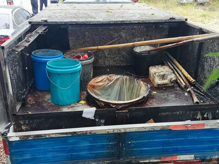 执法人员赶到现场,看到泔水车仍停在路边。车厢疑似经过了改装,变成了一个大泔水箱,泔水箱盖上面放着几个塑料桶。整辆车散发出浓浓的酸臭味。