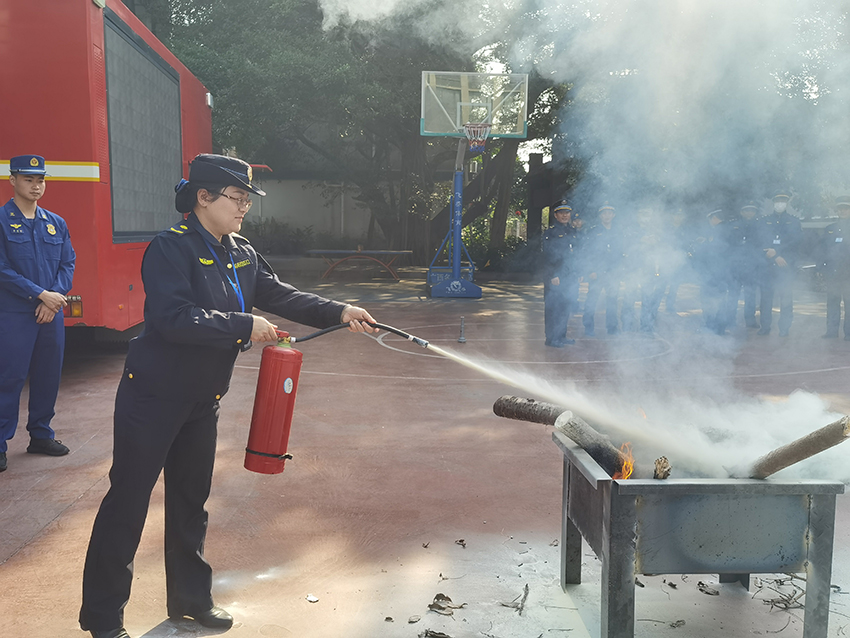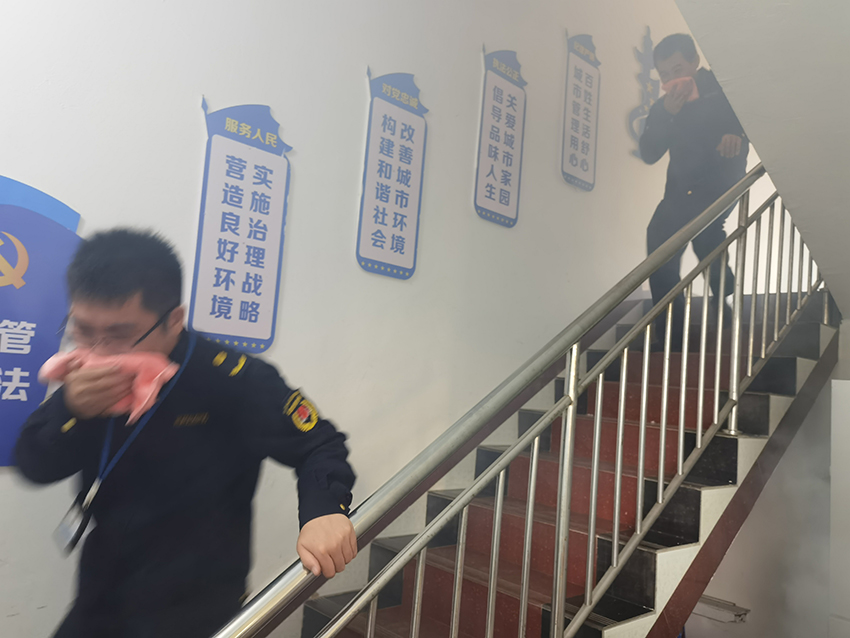 上午10时许,执法部门的办公大楼内浓烟滚滚,警报声响起,模拟火灾场景的消防演练正式开始。执法队员们迅速反应,用湿纸巾掩住口鼻,有序疏散,两分钟内完成全部人员的撤离,并使用了灭火器进行初期火灾的扑救,达到了学以致用的目的。