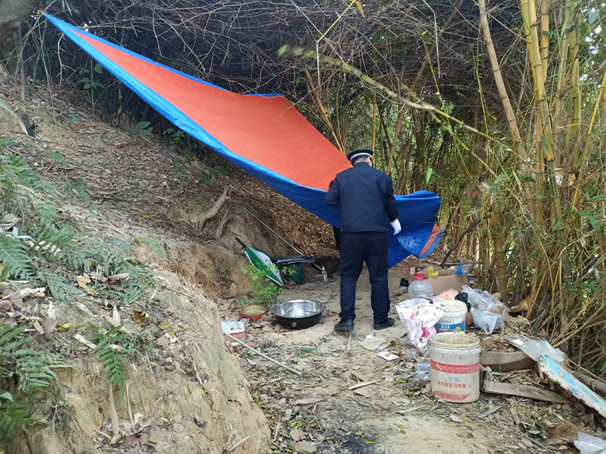 行动中,执法人员还在岸边的绿化丛里发现了一个“钓鱼据点”。拉着帐篷,里面有坐垫、碗筷。执法人员发现这个“据点”明显存在人工挖掘、平整过的痕迹,已经涉嫌毁坏绿地。由于现场无人,执法人员对物品进行清理后,在现场留下执法文书对当事进行告知。