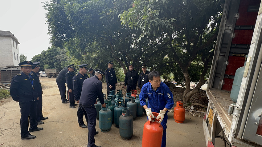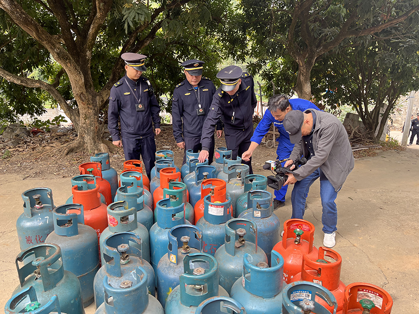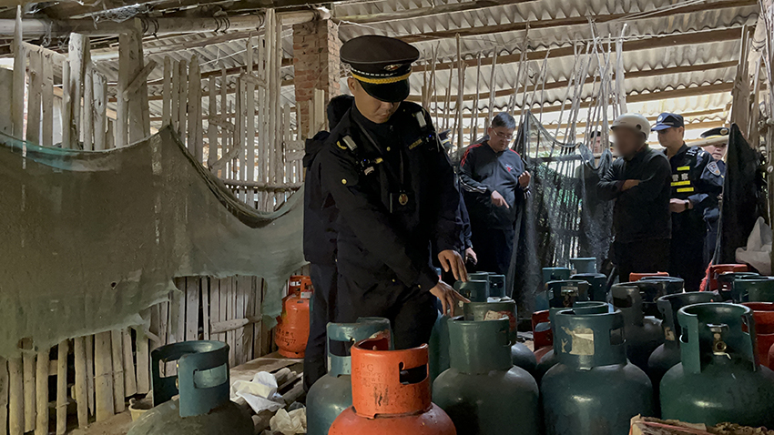 由于投诉没有提供具体的位置,执法人员多次到牛车坪村开展暗访摸排,收集线索。执法人员通过蹲守,运送燃气男子被当场查处。在被当成仓库的平房内,执法人员看到里面密密麻麻地堆放着燃气瓶,执法人员将燃气瓶搬至屋外一一清点查验,发现燃气瓶共有46个,其中19个是满瓶。