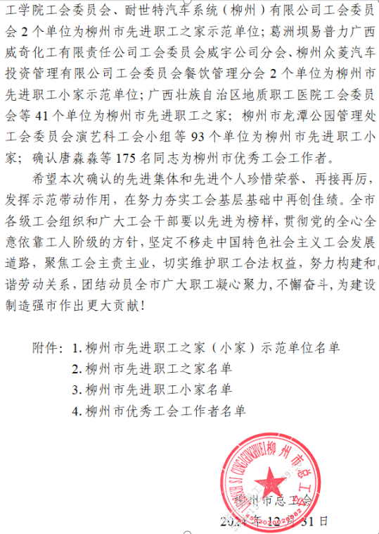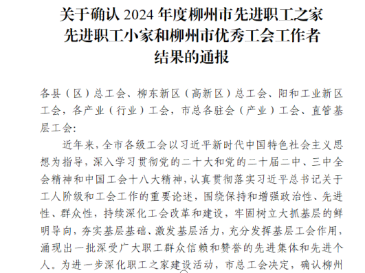 近日,柳州市总工会下发了《关于确认2024年度柳州市先进职工之家、先进职工小家和柳州市优秀工会工作者结果的通报》(柳工字〔2024〕38号),确认了全市一批深受