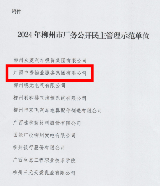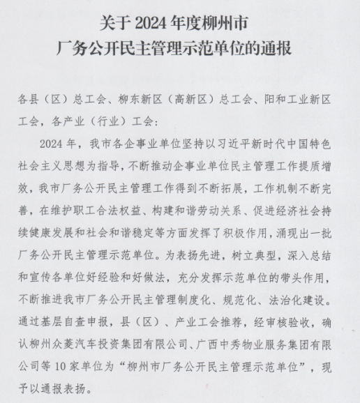 近日,柳州市总工会下发了《关于2024年度柳州市厂务公开民主管理示范单位的通报》,由城中区总工会推荐申报的广西中秀物业服务集团有限公司获“柳州市厂务公开民主管理示范单位”荣誉称号。