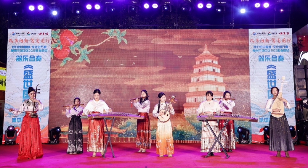 晚会精心编排了“柳韵千年”“古风新春”“我们的中国梦”三个篇章。震撼歌舞、灯光秀的开场,瞬间点燃现场,让观众感受春节申遗成功的喜悦;传统文化展示环节,古筝、琵琶等传统音乐如清泉流淌沁润人心;经典戏剧片段,演员举手投足尽显传统韵味;体育文化宣传中,静兰小学跳绳队带来精彩花样跳绳表演,分享了城中区跳绳发展历程,传递了“同心克难、改革向新、重振柳州” 的体育精神。