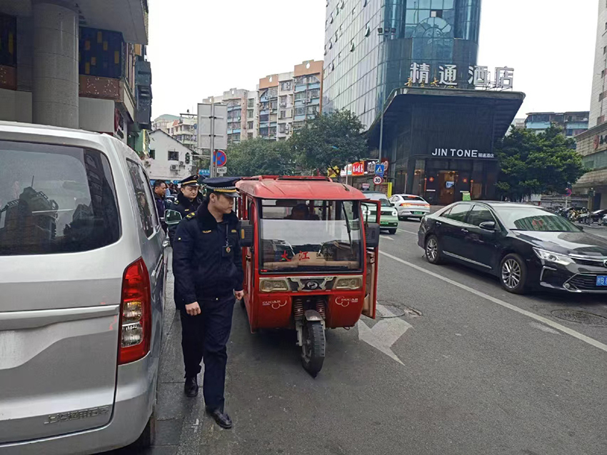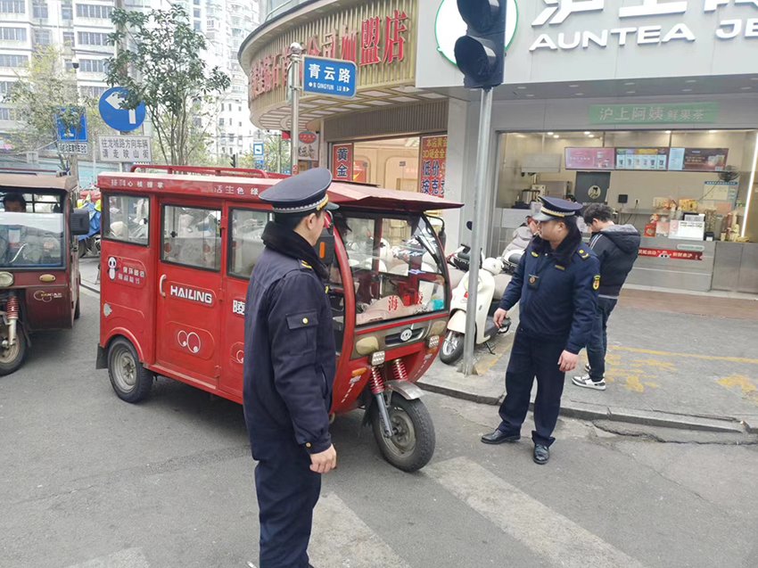 行动中,执法人员“定岗+巡查”相结合,除在青云路口安排人员值守对随意违停等客的三轮车进行宣教、劝离外,同时也加强了对映山街、中山中路钟楼附近等三轮车较为集中路段的巡查。
