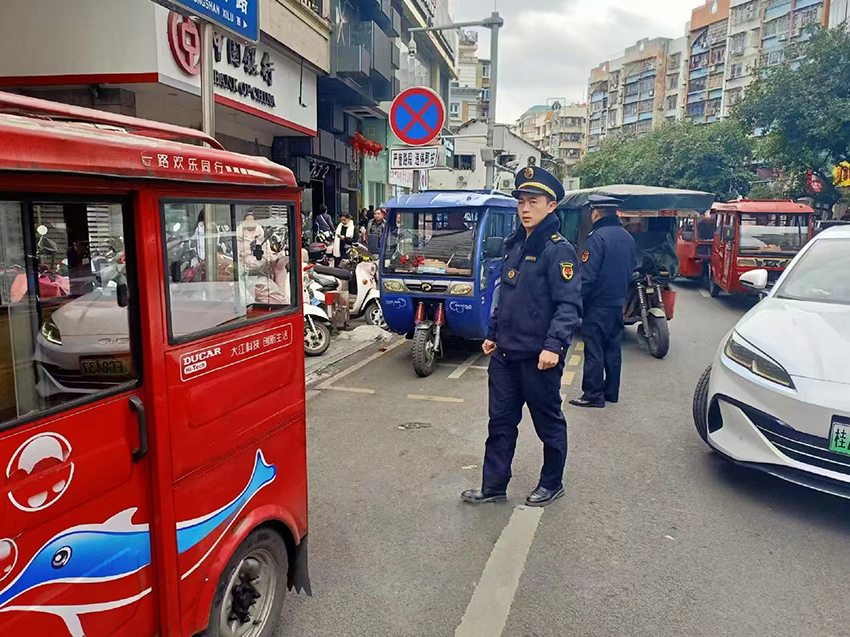 (城中区执法局讯 通讯员邓湖广报道)春节期间,“网红街”青云路三轮车扎堆占道揽客的现象又开始抬头,影响了道路的通行。为还路于民城中区综合行政执法局的执法人员每天都在此值勤蹲守,对占道乱停的三轮车进行劝阻制止,为市民游客的顺畅出行保驾护航。