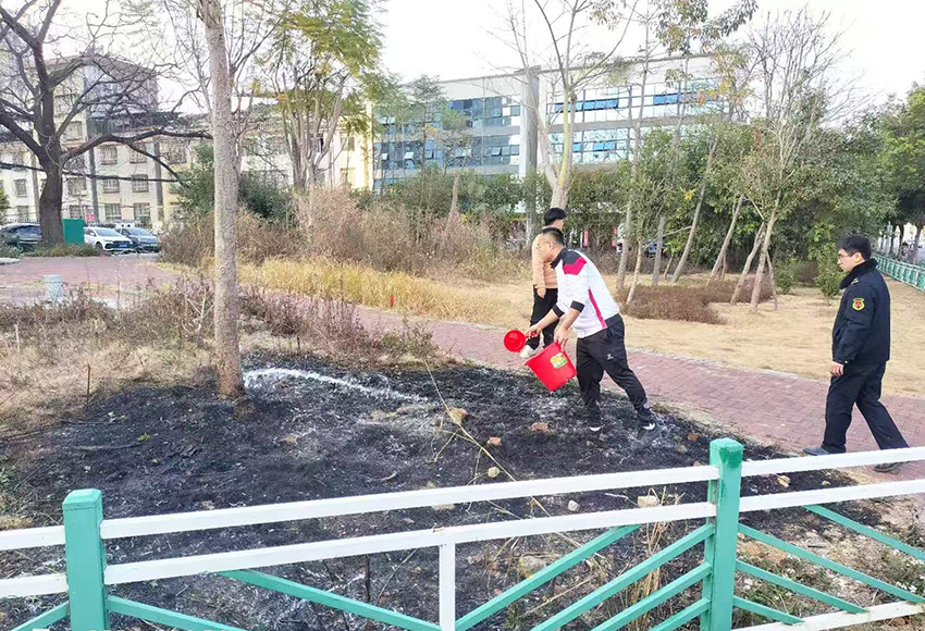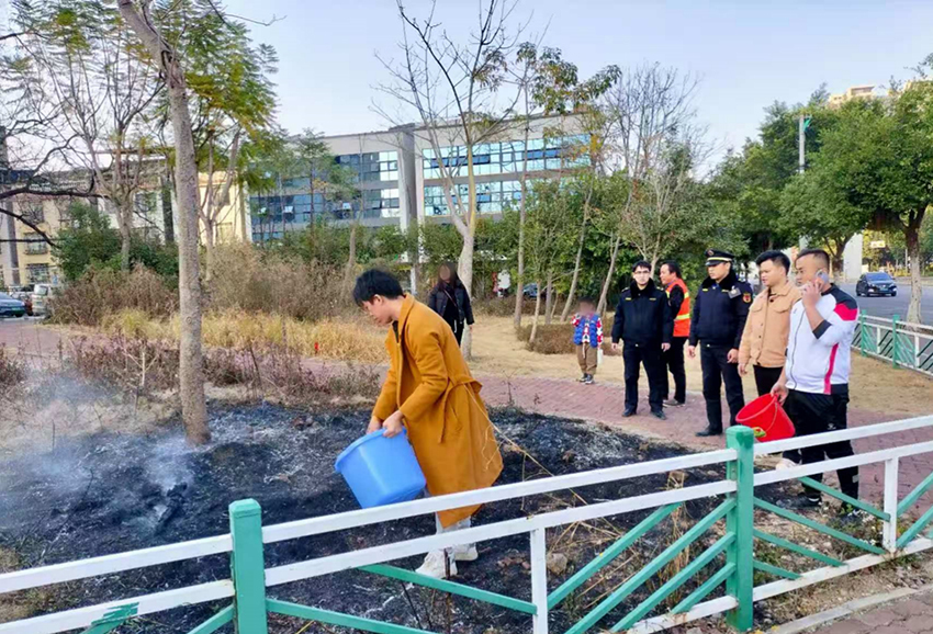 “大家赶紧去帮忙灭火。”见此情形,执法人员顾不上再打扫卫生,立即提着水桶冲向马路对面的起火点,也有人返回办公室拿上了灭火筒。