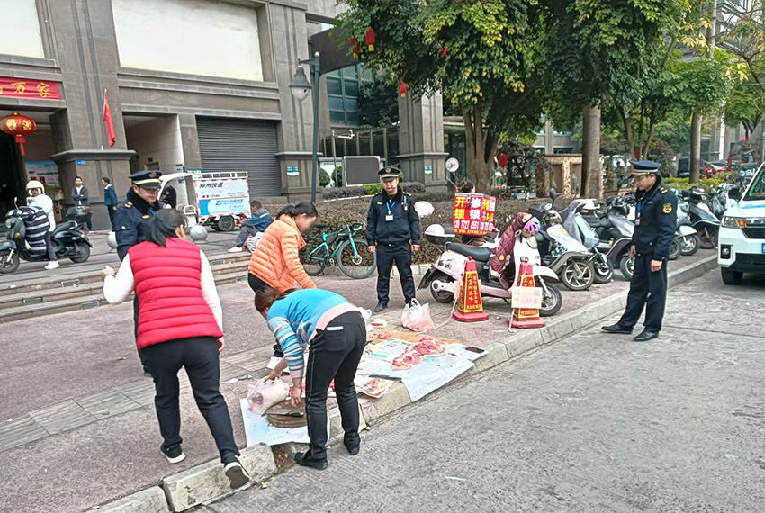 (城中区执法局讯 通讯员邓湖广报道)“有人在小区门口摆了一地的猪肉售卖,影响居民进出。”1月21日上午10点左右,有市民向柳州市智慧城市管理平台反映称,城中区桂中大道中房世纪广场门口有人乱摆卖猪肉,希望执法人员及时处置。