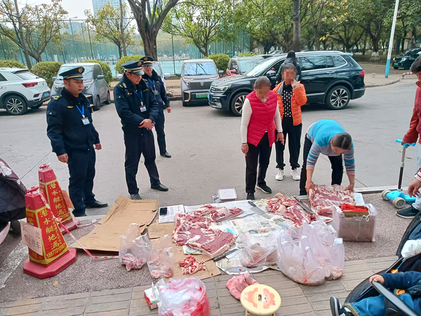 接报后,执法人员迅速赶到现场,看到该小区门口的人行道上铺着一些报纸、纸皮,纸皮上摆着几堆猪肉,旁边地面上摆着砧板电子秤,一名女子正在现场切割猪肉,附近弥漫着一股猪肉的腥味,旁边还围着几名市民,似乎正在购买猪肉。