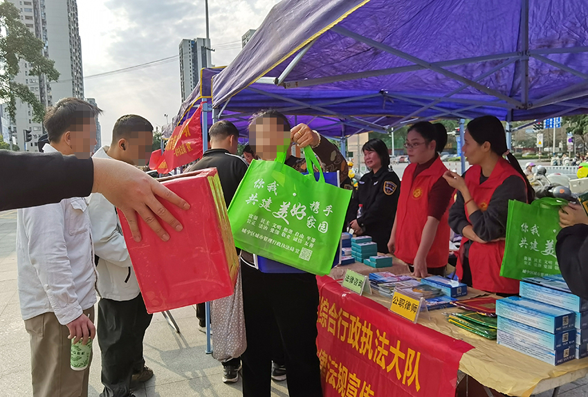 “老板辞退员工最迟多久要结清工钱?”活动还设置了“有奖问答”环节,题目涵盖城市管理相关的法律法规知识。市民们踊跃参与答题,赢取环保袋、法治宣传纪念品等礼品,现场气氛热烈。一名阿姨提着回答问题得到的奖品,十分开心:“这不比超市送鸡蛋有意思?学了几条实用的,以后遇到这种事也懂得怎么做。”