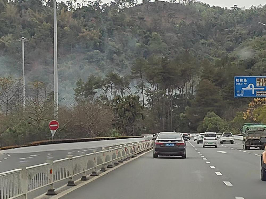 当天下午3点左右,城中区综合行政执法局的队员巡查桂柳路市容,车经三门江大桥附近时,突然看到前方莲花山山脚的树林里升起浓烟,疑似发生山火,执法队员立即驱车前往处置。
