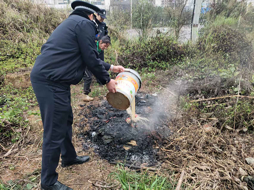 无独有偶,当天有人在环江滨水大道下茅洲路附近的空地上焚烧物品,现场不仅烟雾滚滚且异味四散。执法人员接到附近小区业主投诉后赶到现场,发现当事人是在焚烧衣服给去世老人。
