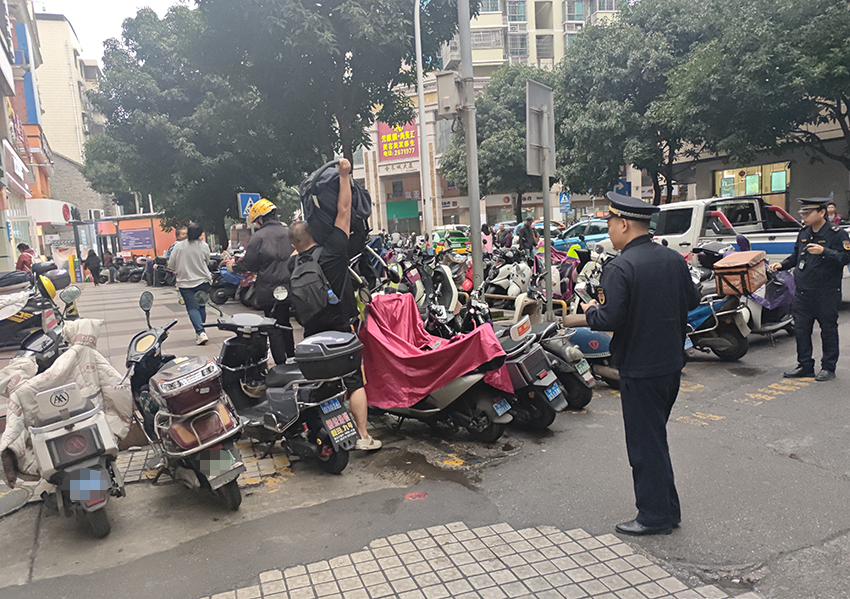 当天上午,有市民向智慧城管平台反映,中山东路东都大厦附近人行道有大量电动车违停,影响道路通行。接报后,执法人员当即赶到现场展开处置。