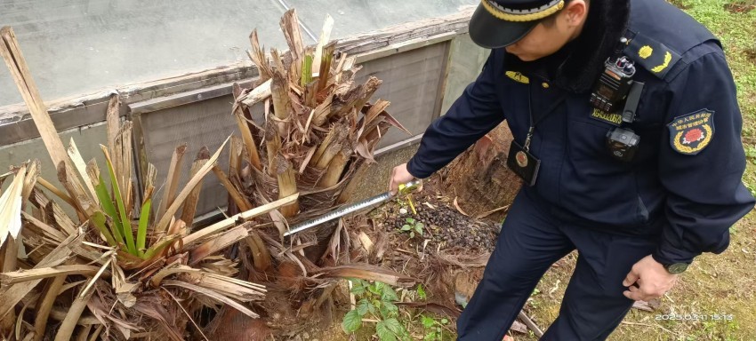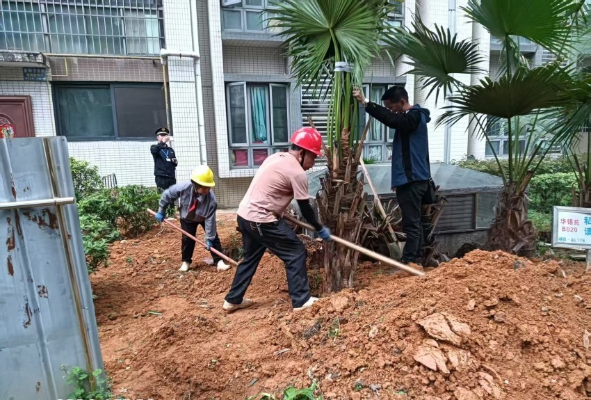 4月10日,物业工作人员已在原树蔸位置补种回6棵蒲葵树,直径均超10厘米。执法人员复查时,新树已挺立风中。