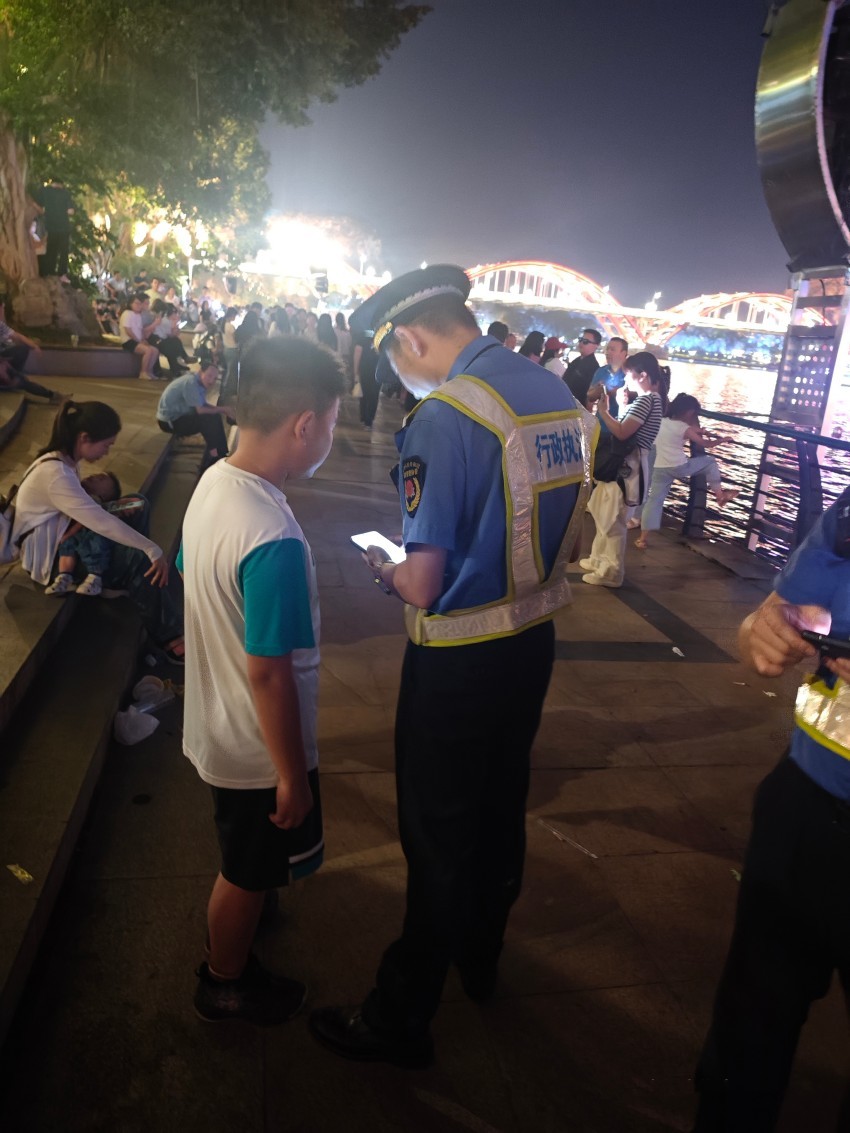 无独有偶,当天晚上在柳江水上音乐喷泉附近的亲水平台上,相似的情景再次上演。当晚9时左右,一名小女孩找到在亲水平台执勤的执法队员,说自己找不到妈妈了,想借电话找妈妈。电话联系上小孩家长后,执法人员陪着小女孩一直等到家长赶到后才转身投入岗位,继续开展工作。