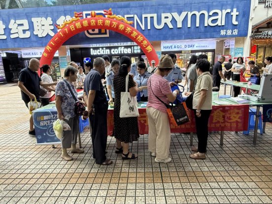 为了进一步深化和加强食品安全的科普宣传工作,广泛传播和普及食品安全相关的科学知识,倡导社会各界积极参与食品安全治理,8月6日上午,城中区市场监督管理局联合区农业农村局、城中公安分局及“八桂食安”志愿服务队等相关部门,在解放南路联华超市有限公司(解放店)门前共同举办了“尚德守法,共享食安”为主题的2025年柳州市城中区食品安全宣传周活动。