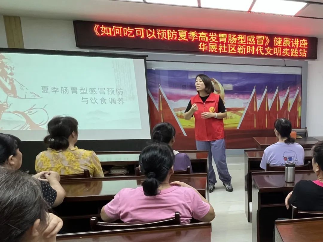 夏至已至,提示着进入一年中气温高、湿度大的天气。烈日炎炎的夏日,暑湿夹杂,吃喝稍不注意,就可能会诱发“胃肠型感冒”。为提高辖区居民健康素养,6月28日上午,华展社区在新时代文明实践站开展“如何吃可以预防夏季高发胃肠型感冒”健康讲座。
