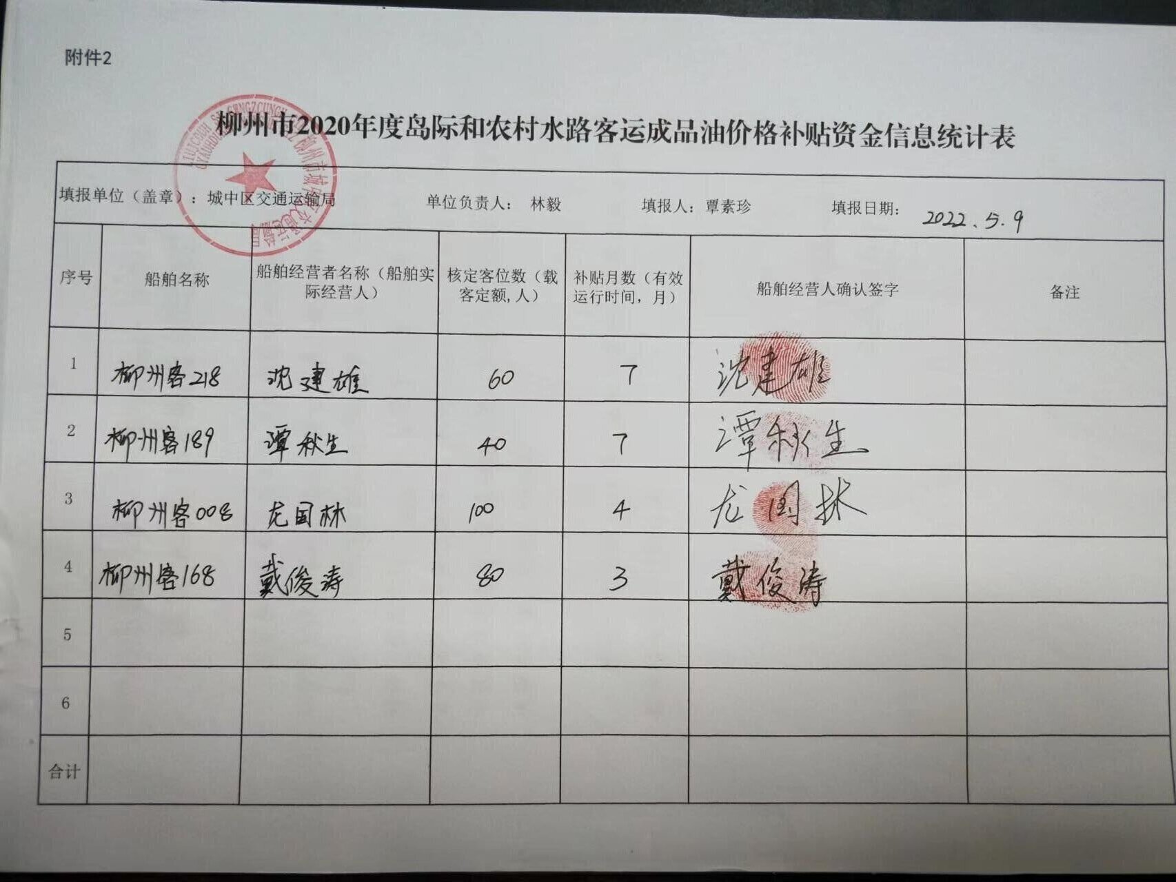 附件:柳州市2020年度岛际和农村水路客运成品油价格补贴资金信息统计表