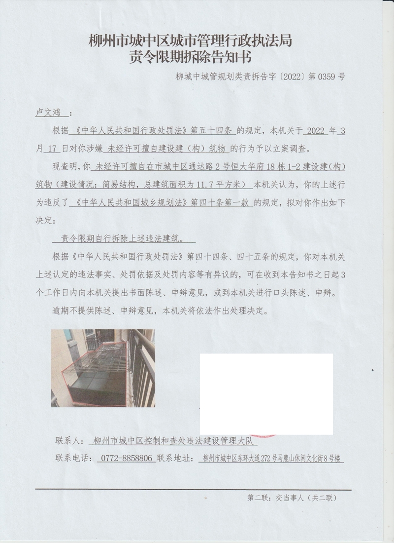 关于你未经许可擅自在市城中区通达路2号恒大华府18栋1-2建设建(构)筑物一案,因无法联系到你本人导致其他方式无法有效送达,现依法在柳州市城中区人民政府门户网站上向你公告送达《柳州市城中区城市管理行政执法局责令限期拆除告知书》(文书号:柳城中城管规划类责拆告字〔2022〕第0359号)。本机关认为,你的行为违反了《中华人民共和国城乡规划法》第四十条第一款,依据《中华人民共和国城乡规划法》第六十四条的规定。对你作出如下决定:责令限期自行拆除本案违法建筑。