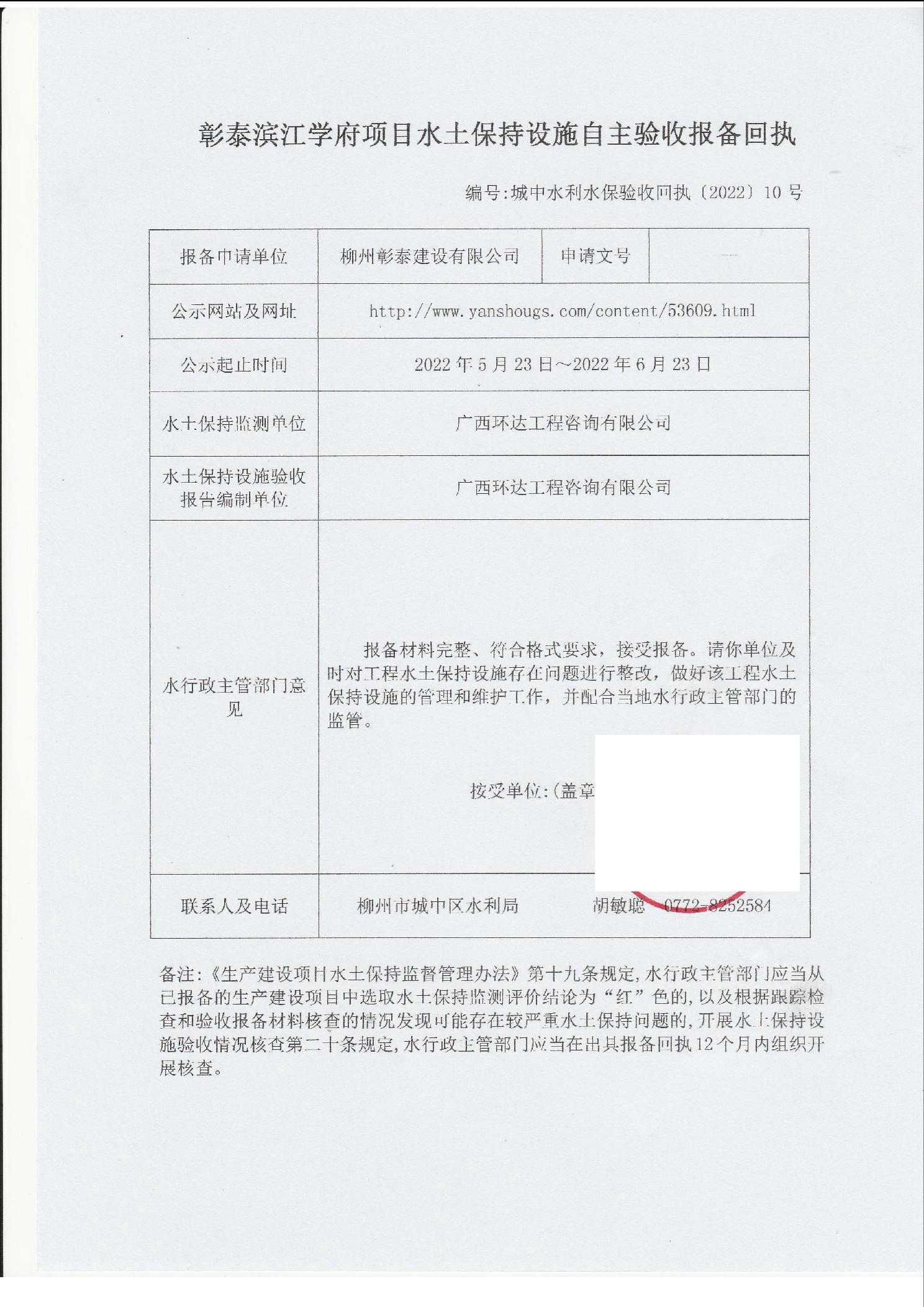 【农业农村局】彰泰滨江学府水土保持设施自主验收报备回执