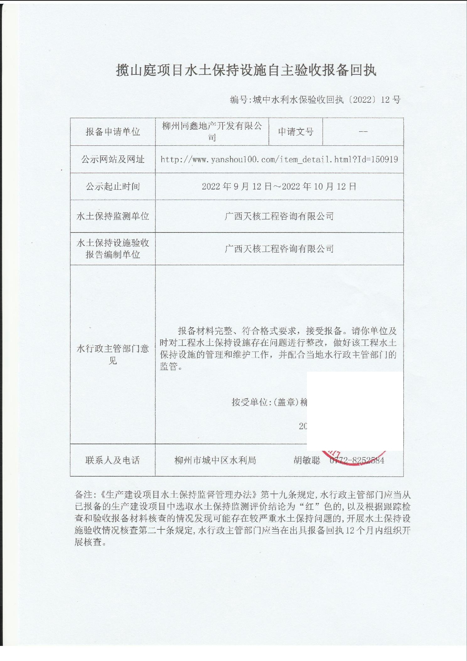 【农业农村局】揽山庭项目水土保持设施自主验收报备回执