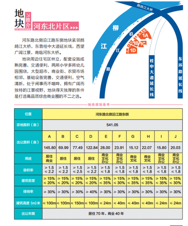 河东路北侧沿江路东侧地块紧邻鹧鸪江大桥,东靠桂中大道延长线,西望广阔江景,南临河东大桥。