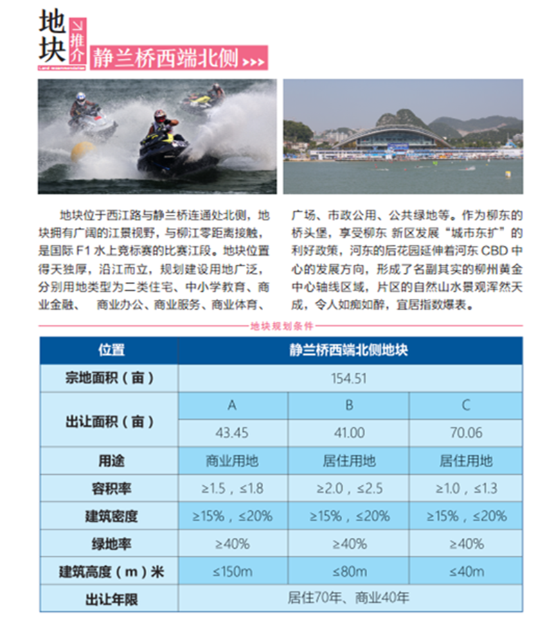 项目位于西江路与静兰桥连通处北侧,地块拥有广阔的江景视野,与柳江零距离接触,是国际F1水上竞标赛的比赛江段。地块位置得天独厚,沿江而立,规划建设用地广泛,分别用地类型为二类住宅、中小学教育、商业金融、商业办公、商业服务、商业体育等。