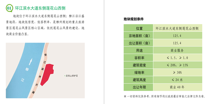 地块位于环江滨水大道东侧莲花山西侧;柳江沿江盛景地段,地块低密度、低容积率,是柳州规划的重点旅游景区莲花山风景区核心区域,依托莲花山风景的建设,地块商业价值凸显。