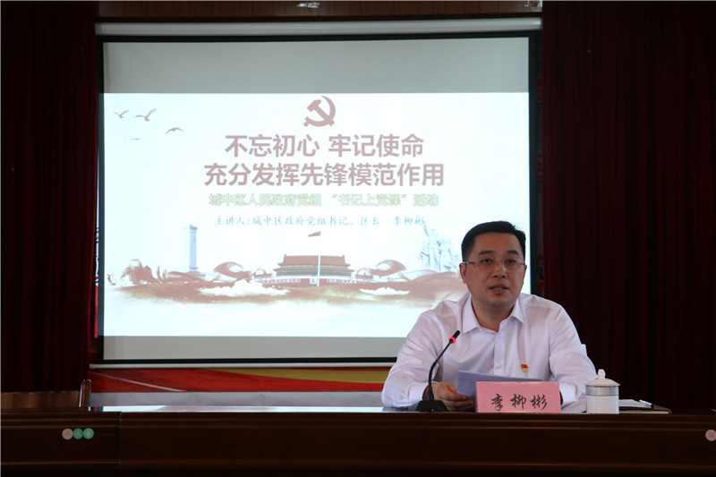 城中区委副书记、区长李柳彬以《不忘初心、牢记使命 充分发挥先锋模范作用》为题讲党课