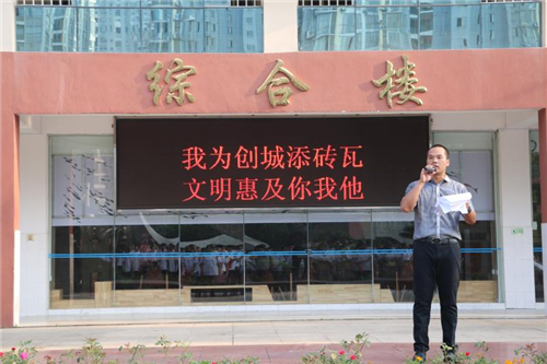 国旗下,政教处罗强主任倡导全体师生积极行动起来,参与到创文明城,做文明人,树文明风的行动中来,争做践行文明的先行者。不管在校内还是校外,都要严格按照创城要求,不断提高自身的文明程度,规范自己的语言和行为,遵守社会各项秩序,自觉维护学校的良好形象,不仅做城市文明的传承者,更要成为城市建设的捍卫者和开拓者,为创建全国文明城市目标的实现贡献自己的一份力。