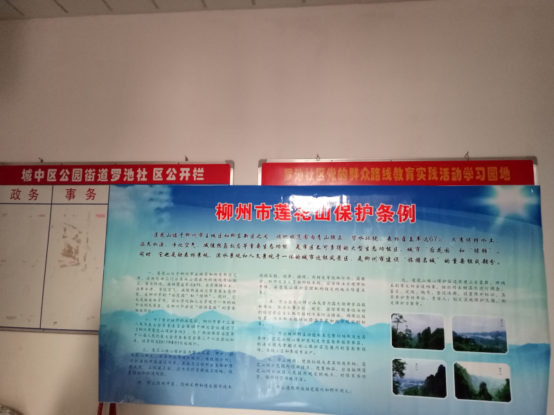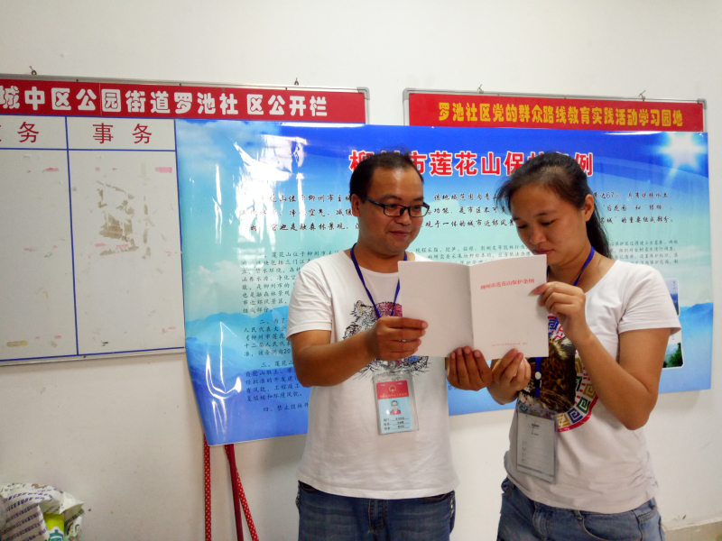 在宣传过程中,司法所工作人员首先对下属辖区的社区进行普法,分发了《柳州市莲花山保护条例》等涉及环境保护的法律法规知识,以及关于莲花山在如何保护山体、禁止滥伐滥采等相关法律法规。