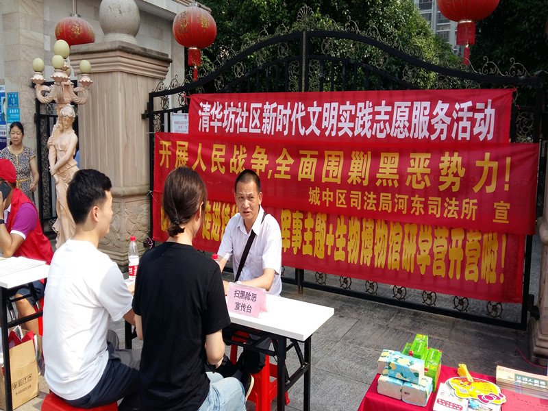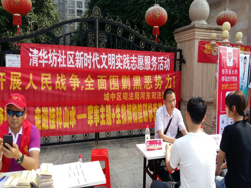 (城中区司法局河东司法所讯 通讯员韦植元报道)为深入开展扫黑除恶专项斗争,提高人们知法、懂法、守法、用法的意识,2019年5月23日上午,城中区司法局河东司法所在新希望小区中门开展扫黑除恶法制宣传活动。