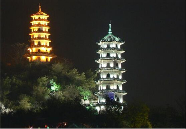 蟠龙双塔:位于柳东窑埠古镇旁的蟠龙山上。蟠龙山又名宝塔山,清代中叶,地方人士为兴柳州文运,选定此风水宝地起塔一座,塔高15米,低径6米,基墙厚达1.1米,料石基础,青砖塔体,六角形,称之“文光塔”。为恢复蟠龙山人文历史,1993年,园林部门在古塔原址上重建“文光塔”,高20.13米(含宝顶),底径6米,为七层六角清式砖塔。枝峰又建“蟠龙塔”,高26.28米,底径6米,钢筋混凝土框架结构,青砖为墙,绿色琉璃瓦脊,葫芦宝鼎,与古朴凝重的文光塔遥相呼应。入夜,双塔彩灯闪烁,交相辉映,成为城市点睛夜景,被评为全国最具赏月观景点之一。