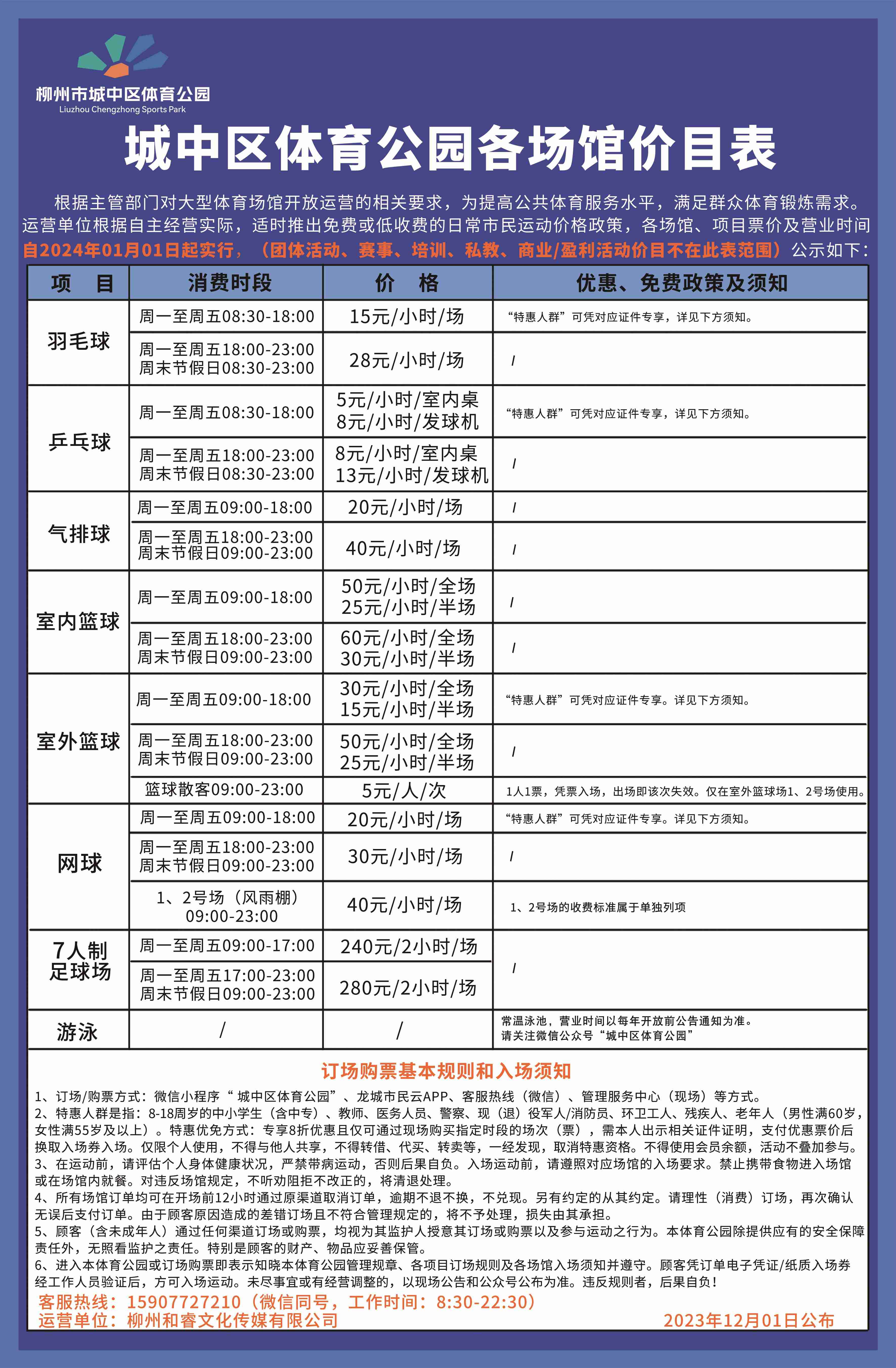 城中区体育公园于2022年9月27日起,由柳州和睿文化传媒有限公司承接运营。根据主管部门对大型体育场馆开放运营的相关要求,为提高公共体育服务水平,满足人民群众体育锻炼需求,运营单位根据自主经营实际,向广大市民朋友继续适时推出免费或低收费的场馆价格政策。
