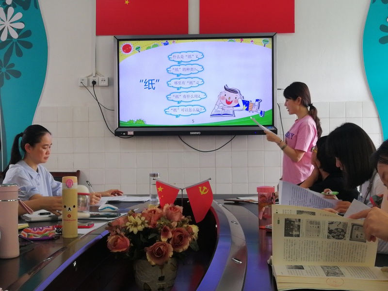 图3:课题组成员何柳莎展示小五班《纸的秘密》主题探究活动。