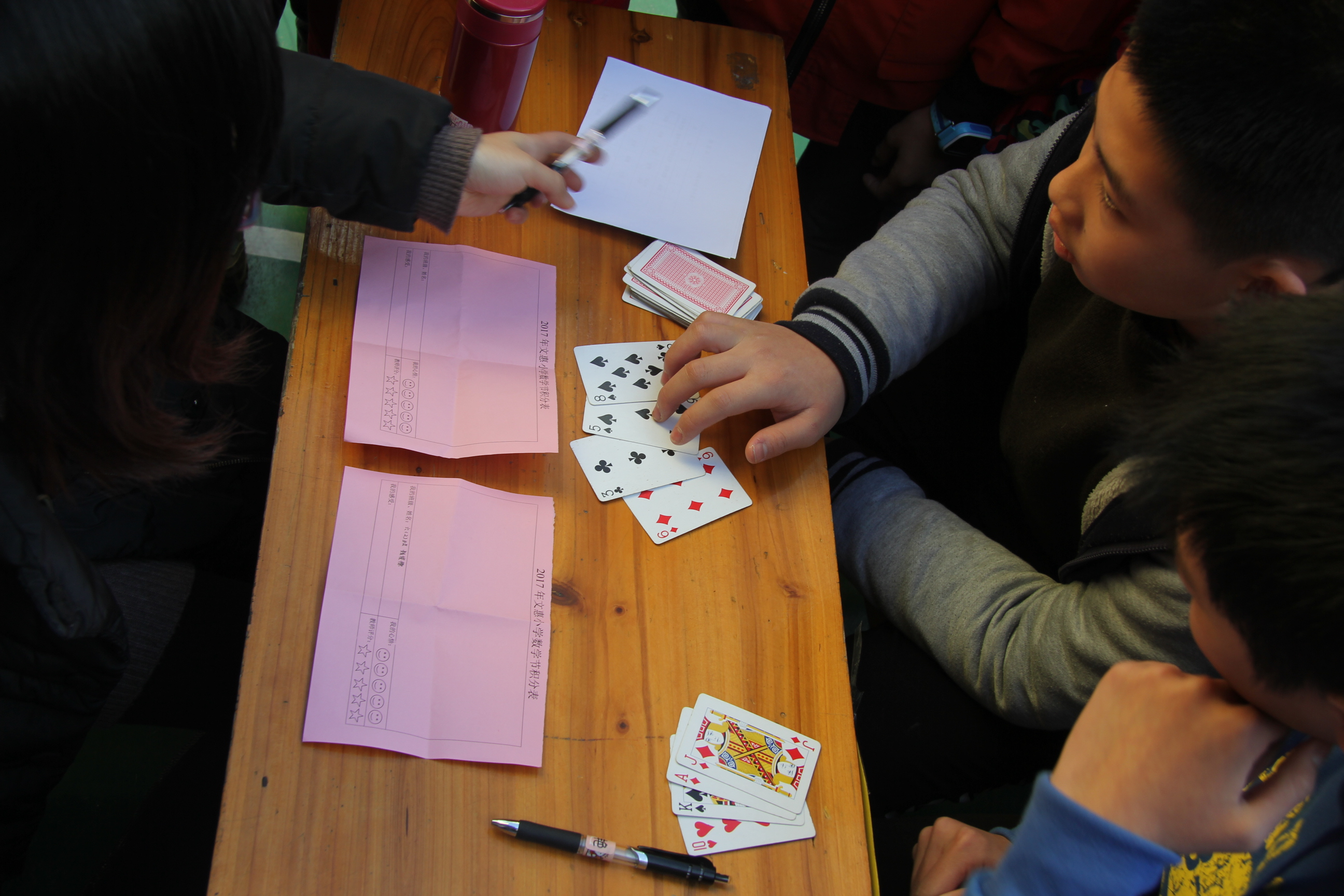 二十四点,要求用扑克牌上抽出的四个数字经过运算,结果等于二十四,看!这些孩子玩得多认真呀!