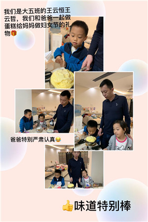 诱惑的蛋糕没有哪个女孩子能抗拒,分园大五班王云恒、王云哲和爸爸一起制作暖心小蛋糕送妈妈,味道特别棒呢!